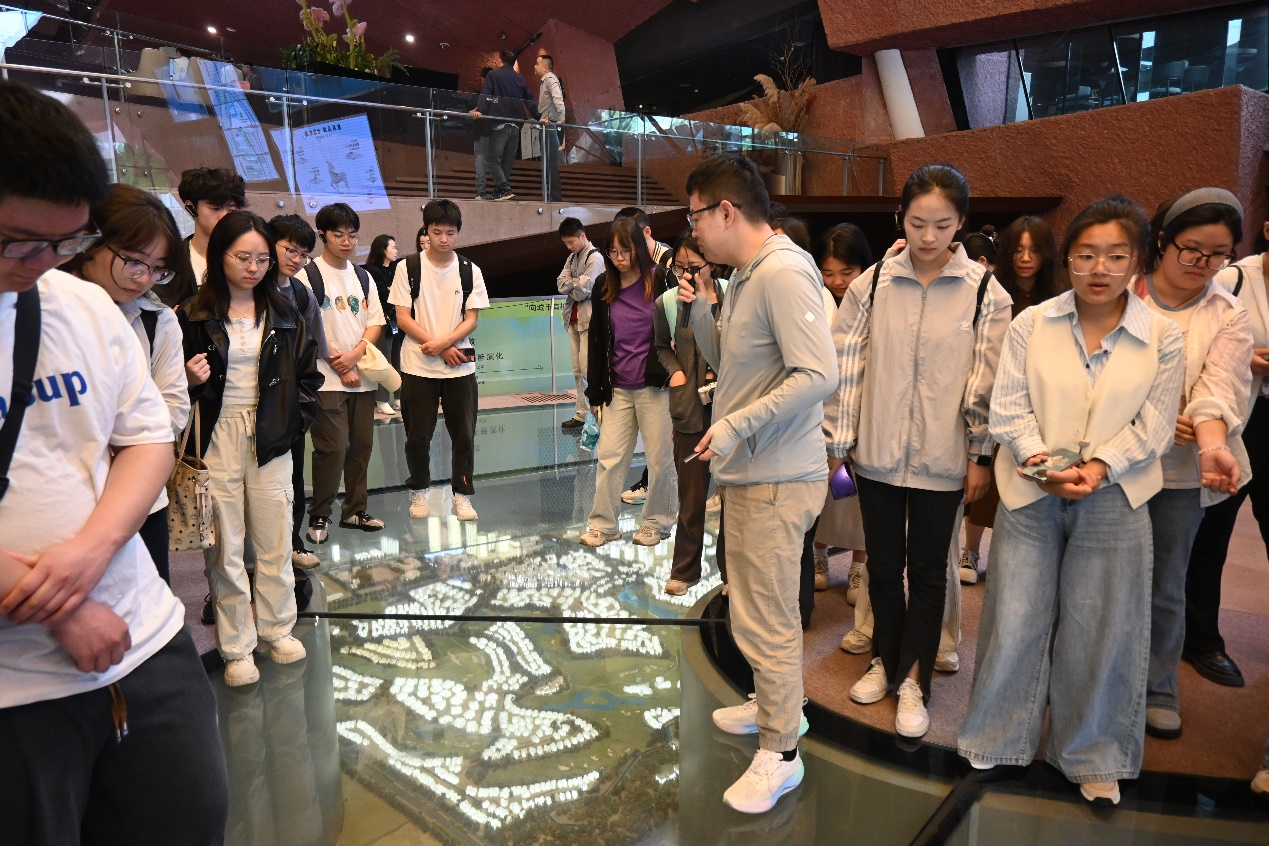 同学们集体从江安校区出发,到达麓湖生态城艺展中心后,工作人员以项目为画布,细细勾勒土地资源规划利用、分区利用与生态利用的理念轮廓,为同学们深入、细致地讲解了麓湖生态城项目的沙盘模型,围绕项目开发过程中的土地资源规划利用、分区利用、生态利用理念和设计理念进行了实践式教学。聆听沙盘讲解后,同学们对土地规划利用的理论知识有了更加具象化、实体化的理解。