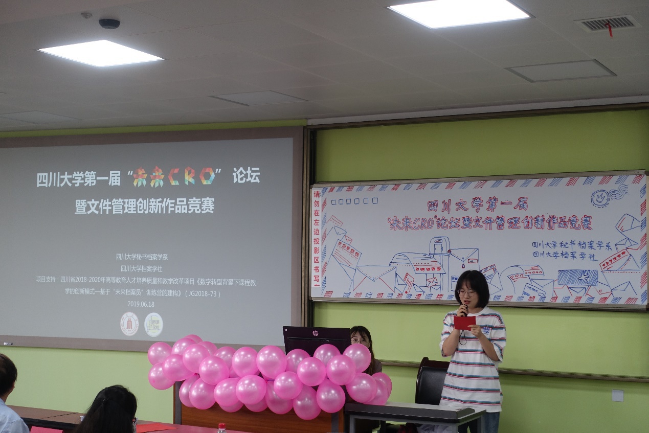2019年6月18日下午13:00-18:30,好博体育秘书档案学系、好博档案学社于江安校区一教B301成功举办好博第一届“未来CRO”论坛暨文件管理创新作品竞赛活动。本次活动依托四川省2018-2020年高等教育人才培养质量和教学改革项目《数字转型背景下课程教学的创新模式—基于“未来档案员”训练营的建构》与本科一年级文书学课程开展,由王萍副教授与周文泓副教授联合负责,旨在培育员工的研究能力,以促进专业建构同新时代本科教育改革与发展精神的融合。为期两月的活动于4月16日正式启动。78名同学在教师与员工导师的指导下,参照科学竞赛作品的规范流程,通过前期培训、开题、研究方案设计、全过程研究、研究报告写作、研究成果展示等形成10组文件管理作品。当天是本次活动的最终成果汇报展示,秘书档案学系乔健教授、王萍副教授、周文泓副教授担任评委。