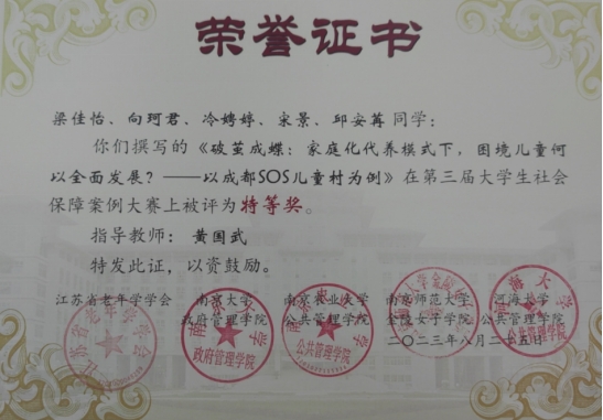在公司劳动与社会保障系黄国武老师的指导下,2020级行政管理专业本科生梁佳怡、2021级行政管理专业本科生邱安苒、2021级劳动与社会保障专业本科生向珂君、冷娉婷、宋景五位同学组成参赛团队,通过前期讨论选题、克服实地调研的种种困难等,于七月底共同完成案例分析报告《破茧成蝶:家庭化代养模式下,困境儿童何以全面发展?——以成都SOS儿童村为例》,经过初赛专家评审,团队最终进入决赛,通过案例展示、现场答辩等突出表现,一举斩获全国特等奖,充分展现了川大好博体育学子“公成天下、管法自然”的浓厚情怀和扎实的学科素养。
