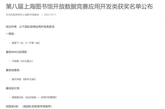 10月8日,第八届上海图书馆开放数据竞赛应用开发类决赛答辩于上海图书馆举行。此次比赛由上海市经济和信息化委员会、上海市文化和旅游局指导,由上海图书馆(上海科学技术情报研究所)、国际科学技术信息理事会(ICSTI)、上海市中心图书馆主办,与CADAL项目管理中心、中国历代人物传记资料库项目(CBDB)、复旦大学图书馆等多家单位进行合作。本届大赛以“链汇古今,AI赋人文”为主题,面向全球征集优秀移动应用原型、创意及算法。上海图书馆开放数据竞赛自2016年起已成功举办7届,被列入好博体育信息资源管理专业竞赛名单。大赛共吸引来自28个省市、国内外的一百多支队伍参赛,参赛选手涵盖了高校员工、企业团队、政府人员。本届大赛共设有应用开发类赛道、创意论文类赛道和算法类赛道,其中应用开发类赛道设一等奖1名、最佳Web3应用奖1名、最佳创意奖1名、最佳设计奖1名和优胜奖4名。