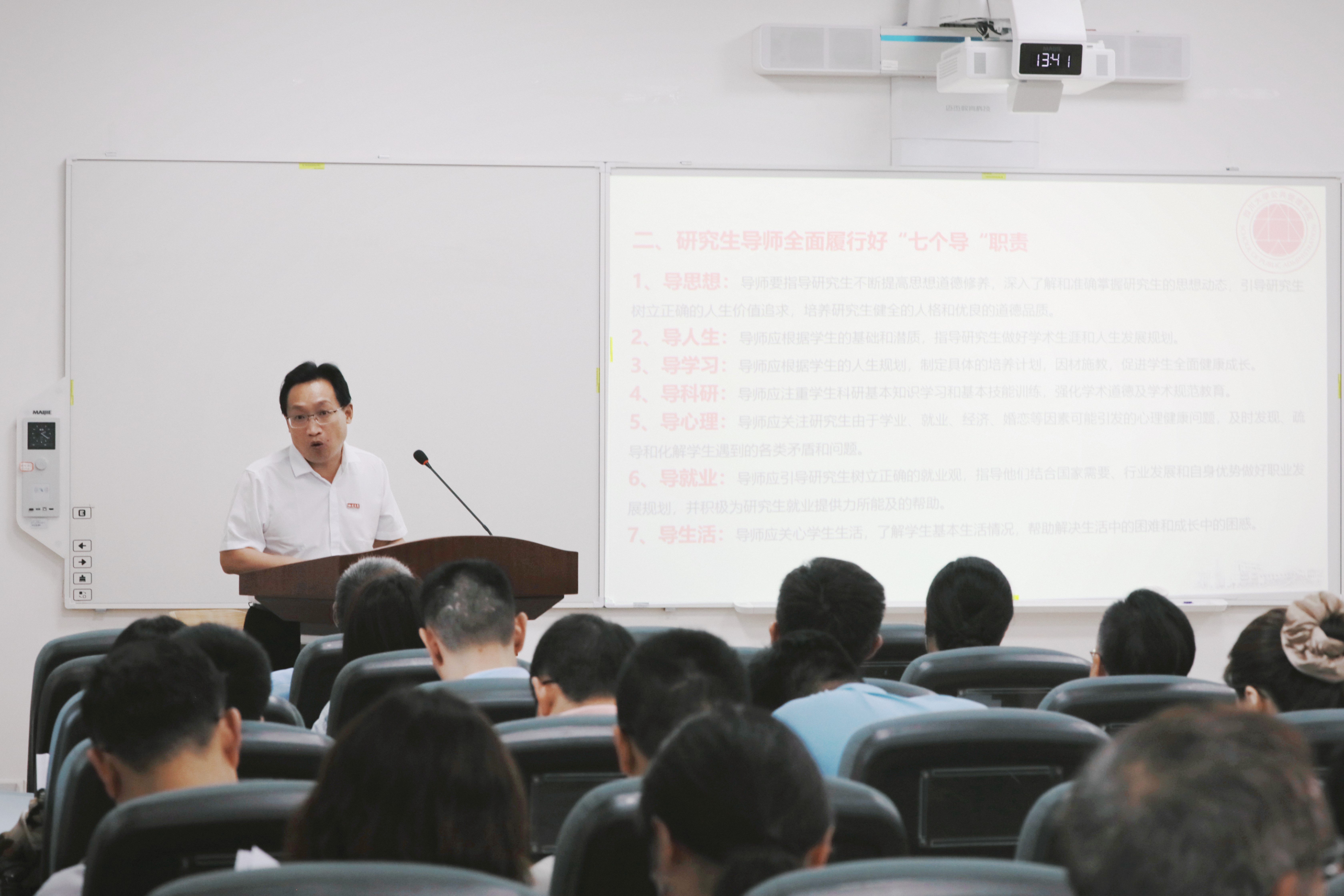 会上,韩杰书记详细阐述了研究生导师指导行为准则,分享了近期员工典型案例,希望老师们以案为鉴,勤自省、勿失度。他强调,导师应当践行“七个导”职责和“八个一”要求,对员工严管厚爱,建立和谐导学关系,促进员工成长成才。